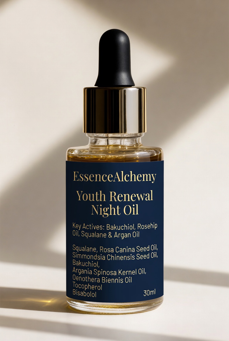 EssenceAlchemy Youth Renewal Night Oil is a luxurious overnight treatment that works while you sleep to visibly firm, plump, and renew the skin. Blended with bakuchiol, rosehip oil, and antioxidant-rich botanicals, it helps reduce the appearance of fine lines, improve elasticity, and wake up to smoother, more radiant skin.